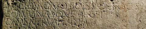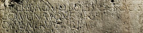 - [---]ci(us) L(uci) l(ibertus) Agato portitor soc(iorum) s(ervus) / [---] columnasque mag(nas) fi(guras?) / [de s]uo Menervai(!) d(onum) d(at) l(ibens) m(erito)