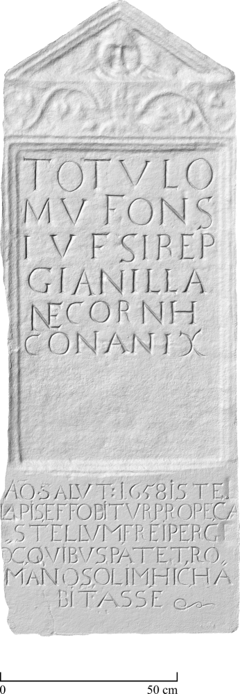 - Totulo / Mufonis (?) / f(ilius) v(ivus) f(ecit) sib(i) et / Giamillae / Necorni f(iliae) (?) / con(iugi) an(norum) LX