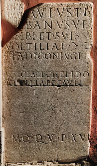 - T(itus) Gavius T(iti) l(ibertus) / Urbanus v(ivus) f(ecit) / sibi et suis / Voltiliae |(mulieris) l(ibertae) / Iadi coniugi / Peticia L(uci) l(iberta) Chelido / Voltilia P(ubli) l(iberta) Paull[a] / l(ibertis) l(ibertabusque // l(ocus) m(onumenti) q(uo)q(uo)v(ersus) p(edes) XVI