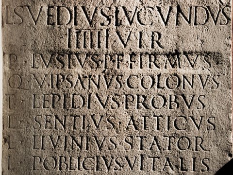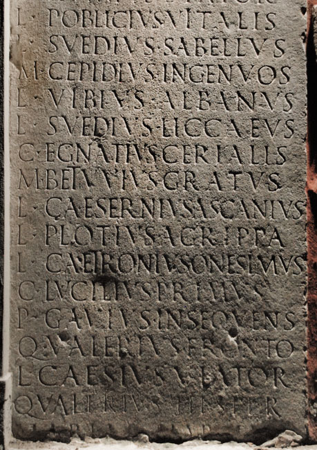 - L(ucius) Suedius Iucundus / IIIIIIvir / P(ublius) Lusius P(ubli) f(ilius) Firmus / Q(uintus) Vipsanus Colonus / T(itus) Lepidius Probus / L(ucius) Sentius Atticus / L(ucius) Livinius Stator / L(ucius) Poblicius Vitalis / L(ucius) Suedius Sabellus / M(arcus) Cepidius Ingenuos(!) / L(ucius) Vibius Albanus / L(ucius) Suedius Liccaeus / C(aius) Egnatius Cerialis / M(arcus) Betuvius Gratus / L(ucius) Caesernius Ascanus / L(ucius) Plotius Agrippa / L(ucius) Caetronius Onesimus / C(aius) Lucilius Primus / P(ublius) Gavius Insequens / Q(uintus) Valerius Fronto / L(ucius) Caesius Viator / Q(uintus) Valerius Hesper / M(arcus) Arius Marcellus