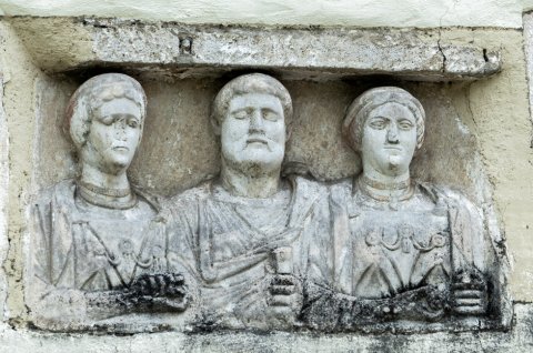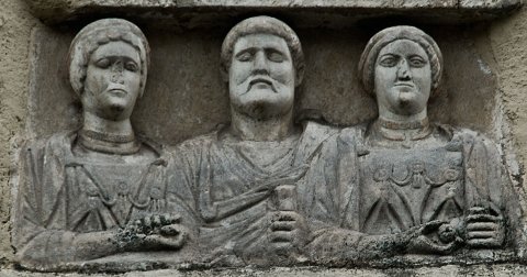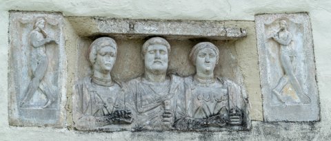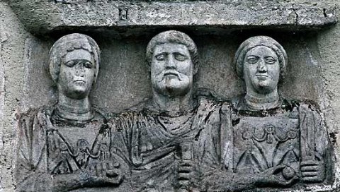 - In Rechtecknische drei Brustbilder einer Familie. Links einheimische Frau: Haube, Umhang, Fibeln, Brustschmuck mit drei Scheiben, Halsband, Halsreif mit Lunula, Armband. In der Mitte Mann: bärtig, Tunica, Toga contabulata, in der Linken Rolle (volumen). Rechts einheimische Frau: Haube Umhang, Fibeln, Brustschmuck mit drei Scheiben, Halsband, Halsreif mit Lunula, in der Linken Apfel.