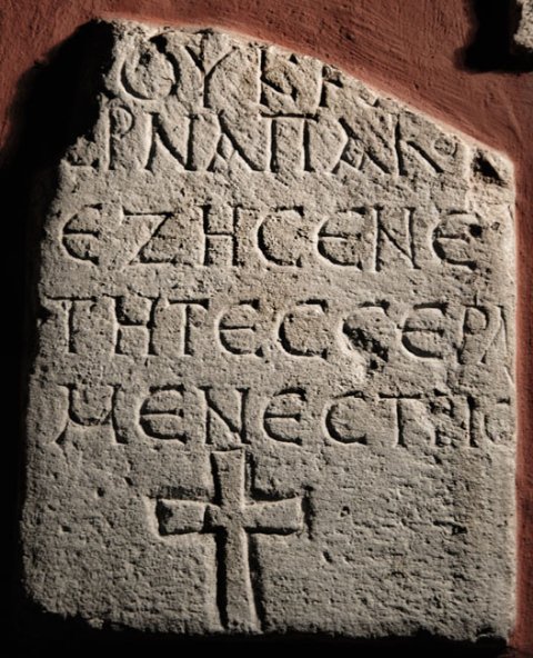 [Ε]οὐκρά[της] {Εὐκράτης} / Ἐρναπάκου / ἔζησεν ἔ/τη τέσσερα / με̑νες τρῖς / ☩