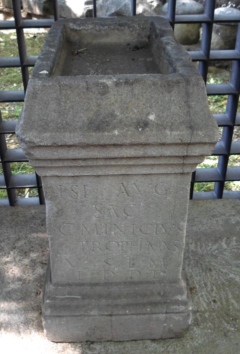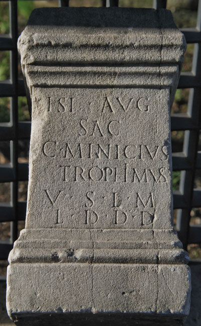 - Isi(di) Aug(ustae) / sac(rum) / C(aius) Minicius / Trophimus / v(otum) s(olvit) l(ibens) m(erito) / l(ocus) d(atus) d(ecreto) d(ecurionum)