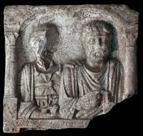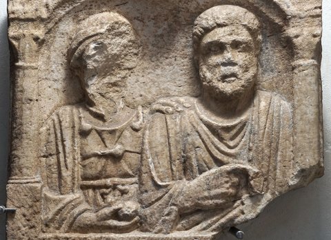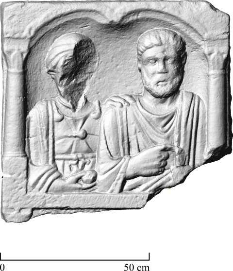 - Zwischen Säulen mit Doppelbogen zwei Halbfiguren (Ehepaar). Links einheimische Frau: Haube, gegürtetes Gewand, Doppelknopffibeln an den Schultern und auf der Brust, Halsreif mit Lunula, Umhang, in der Rechten Apfel. Rechts Mann: bärtig, Tunica, Toga, in der Linken Rolle (volumen). Unter dem Bildfeld Rest einer Säule vom Rahmen des Schriftfeldes.