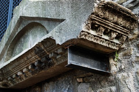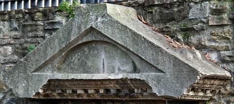- Aus einem Block gearbeitetes Giebeldach mit eckigem Firstbalken und Konsolgesimsen an den erhaltenen drei Seiten. In das Giebelfeld eingetiefter Rundbogen. Rahmen des Giebels abgearbeitet.