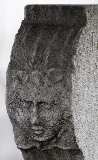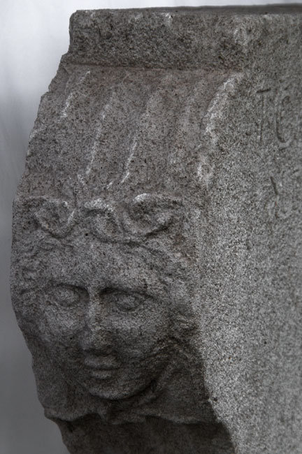 - Plattenförmiger Tischfuß, Schmalseiten S-förmig geschwungen, vordere Schmalseite kanneliert, auf der Wölbung Gorgoneion. Inschrift auf der Breitseite.