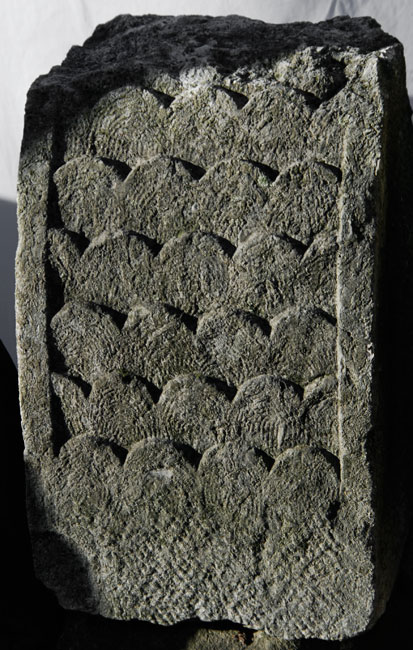 - Oberseite eines Bogens: zwischen Rahmenleisten Reihen von halbrunden Schuppen.