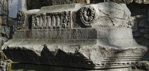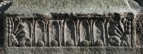 - Pulvini mit Rosetten, dazwischen Basis einer Bekrönung (Pyramidenstumpf ?) mit Pfeifenstabfries zwischen Halbpalmetten. Unten profiliertes Gesims mit tordiertem Band und Zahnschnitt.