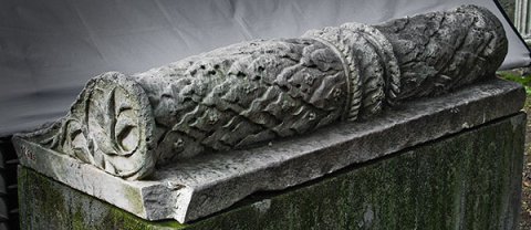 - Geschnürter Pulvinus mit Blattschuppen, in der Volute spiralig eingerollter Zweig. Unprofilierte Deckplatte.