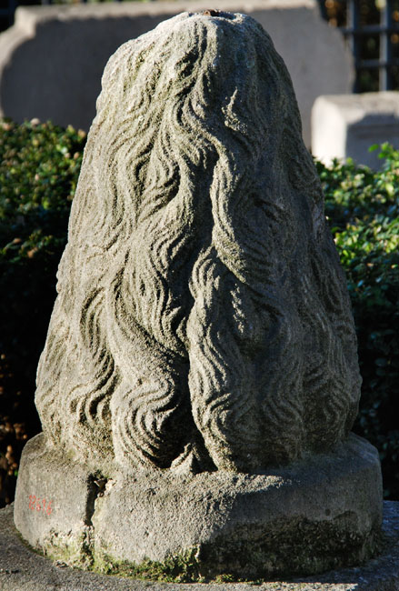 - Auf rundem Sockel kegelförmiger Aufsatz mit Wellenrelief.