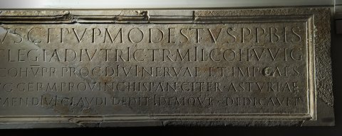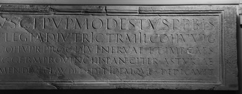 - [Q(uintus) Petroni]us C(ai) f(ilius) Pup(inia) Modestus p(rimus) p(ilus) bis / [leg(ionis) XII Fulm(inatae) et leg(ionis)] I Adiu[t]ric(is) trib(unus) mil(itum) coh(ortis) V vig(ilum) / [tr(ibunus) coh(ortis) XII urb(anae) tr(ibunus) coh(ortis) V pr(aetoriae) p]rocurator divi Nervae et Imp(eratoris) Caes(aris) / [Nervae Traiani Aug(usti) Germ(anici) pro]vinc(iarum) Hispan(iae) citer(ioris) Asturiae / [et Callaeciarum flamen d]ivi Cla[udi] dedit idemque dedicavit