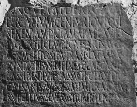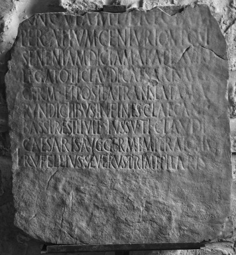 - [H]anc viam derectam / per Atium centurion(em) post / sententiam dictam ab A(ulo) Plautio / legato Ti(beri) Claudi Caesaris Aug(usti) / Germ(anici) et postea translatam a / Rundictibus in fines C(ai) Laecani / Bassi restituit iussu Ti(beri) Claudi / Caesaris Aug(usti) Germ(anici) Imperatoris / L(ucius) Rufellius Severus primipilaris