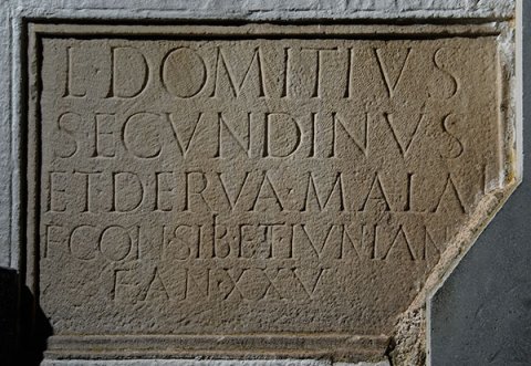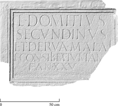 - L(ucius) Domitius / Secundinus / et Derva Malai / f(ilia) con(iux) sibi et Iunian[o] / f(ilio) an(norum) XXV