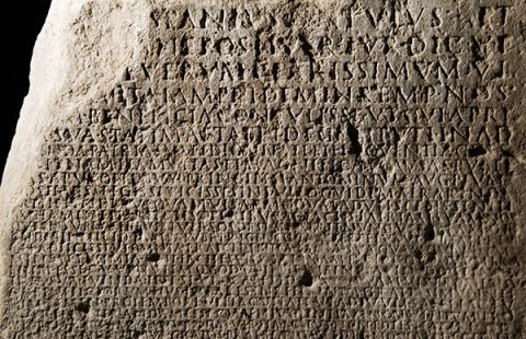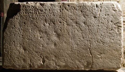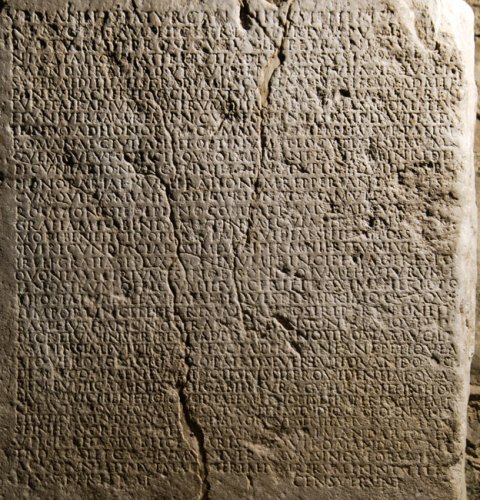 - L(ucio) Fabio [L(uci) f(ilio)] Pup(inia) Sev[e]r[o] / quaestor(i) urbano / [de]cu[r(iones) et] plebs T[ergesti]nor(um) // ] K[a]l(endas) Novembr(es) / [quod ---]spanius Lentulus / et [---]s Nepos II v[i]r(i) iur(e) dic(undo) v(erba) f(ecerunt) / [L(ucium) Fabium S]everum clarissimum vi/[rum m]ulta iam pridem in rem p(ublicam) nos/[tra]m beneficia contulisse ut qui a pri/[m]a sua statum aetate id ege[r]it uti in ad/[iuva]nda patria sua et dignitate et el[o]quentia cres/[ce]ret nam ita multas et magnificas causas publi/[c]as aput optimum principem Antoninum Aug(ustum) Pium / [a]dseruisse egisse vicisse sine ullo quidem aerari nos/[t]ri inpendio ut quamvis admodum adulescens senili/bus tamen et perfectis operibus ac factis patriam suam nos/que insupe[r] sibi universos obstrinxerit nunc vero tam gr/andi beneficio tam salubri ingenio ta[m] perpetua ut[il]itate rem / p(ublicam) n(ostram) adfecisse ut omnia praecedentia facta sua quamquam im/mensa et eximia s[i]nt facile superari[t] nam in hoc quoque mira/bilem esse c(larissimi) v(iri) virtutem quod cotidie in bene faciendo et in pa/tria sua tuenda ipse se vincat et id[cir]co [q]uamvis pro mensu/ra beneficiorum eius impares in referenda gratia simus inte/rim tamen pro tempore vel facultate ut adiuvet saepe factu/[r]us rem[u]nerandam esse c(larissimi) v(iri) benevolentiam non ut illum pro/niorem habeamus aliut enim vir ita natus non potest facere sed / ut nos iudicantibus gratos praebeamus et dignos tali decore ta/lique praesidio q(uid) f(ieri) p(laceret) d(e) e(a) r(e) i(ta) c(ensuerunt) primo censente Calpurnio Certo / cum Fabius Severu[s vi]r amplissimus adque clarissimus tanta pietate tanta/[q]ue adfectione rem p(ublicam) n(ostram) amplexus sit itaque pro minimis ma/[x]imisque commodis eius excubet adque omnem praestantiam / [s]uam exerat ut manifestum sit id eum agere ut non modo nobis sed pro/ximis quoque civitatibus declaratum velit esse se non ali quam / [pa]triae suae natum et civilia studia quae in eo quamvis admodum / iuvene iam sint peracta adque perfe[c]ta ac senatoriam dig/[ni]ta[t]em hac maxime ex causa concupivisse uti patriam su/[am c]um ornatam tum ab omnib[us] iniuriis tutam defensamque / praestaret interim aput iudices a Cae[sar]e datos interim aput ip/[sum I]mperatorem causis publicis patro[ci]nando quas cum iusti/tia divini principis tum su[a] eximia ac [pr]udentissima oration(e) / s[e]m[pe]r no[b]is victoria firmiores r[e]misit ex proximo vero // ut manifestatur cael[es]tibus litteris Antoni/ni Aug(usti) Pii tam feliciter d[e]siderium pu[b]licum a/pud eum sit prosecutus impetrando uti Car/ni Catalique attributi a divo Augusto rei publi/cae nostrae prout qui meruissent vita atque cen/su per aedilitatis gradum in curiam nostram admit[te]/rentur ac per hoc civitatem Romanam apisceren/tur et aerarium nostrum ditavit et curiam complev[it] / et universam rem p(ublicam) n(ostram) cum fomentis ampliavit adm[it]/tendo ad honorum communionem et usurpation[em] / Romanae civitatis et optimum et locupletissimum / quemque ut scilicet qui olim erant tantum in redit[u] / pecuniario nunc et in illo ipso duplici quidem per / honorariae numerationem repperiantu[r e]t sin[t] / cum quibus munera decurionatus iam ut pauci[s one]/rosa honeste de pl[e]no compartiamur ad cui[ius rei] / gratiam habendam ut in saecula perm[a]nsu[ro eius] / modi beneficio oportuerat quidem si fieri poss[et et] / si verecundia clarissimi viri permitteret universos n[os] / ire et gratias ei iuxta optimum principem agere sed / quoniam certum est nobis onerosum ei futurum t[a]/le nostrum officium illut certe proxime fieri opo[r]tet o(b) statuam ei auratam equestrem primo quoque / tempore in celeberrima fori [n]ostri et i[n] / basi eius hanc nostram c[o]nsensionem adque hoc / decretum inscribi uti ad posteros nostros tam volt[us] / amplissimi viri quam facta per[m]aneant petique a / [Fa]bio Vero egregio viro patris Severi uti quando q[ui]dem et commentum hoc ipsius sit providentiae qua / rem publicam n(ostram) in[f]atigabili cura gubernat et in hoc / plus publici benefici(i) quod talem et nobis et imperio civem p[ro]creavit adque formavit cuius opera studioq(ue) et ornatio[res] / et tutiores in dies nos magis magisque sentiamus uti patiatu[r] / se in hanc rem ad fili[u]m suum legari mandarique sibi / uti gratias publice c[l]ariss[im]o viro mandatu no[s]/tro agat et gaudium universorum singulorumqu[e] / ac voluntatem ut mag[i]ster talium rerum in notitia[m] / eius perferat censuerunt