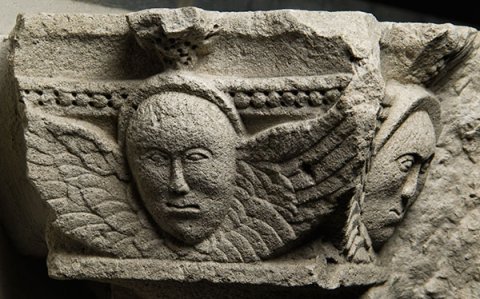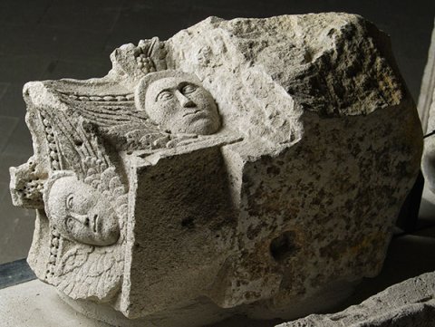 - rundum abgebr., zu einem mittelalterlichen Kapitell mit Engelsköpfen umgearbeitet
