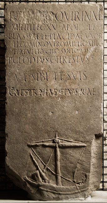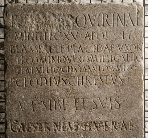 - [[P(ublio) Clodio]] Quirinali / militi leg(ionis) XV Apol(linaris) et / Blassiae L(uci) f(iliae) Placidae uxori / et Cominio Vero mil(iti) leg(ionis) XIII G(eminae) / et A(ulo) Tullio Chrysanto amico / P(ublius) Clodius Chrestus / v(ivus) f(ecit) sibi et suis / Caeserniae Severae
