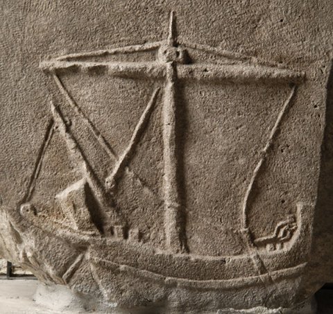 - Rahmenlose Stele, unterhalb der Inschrift Frachtschiff.