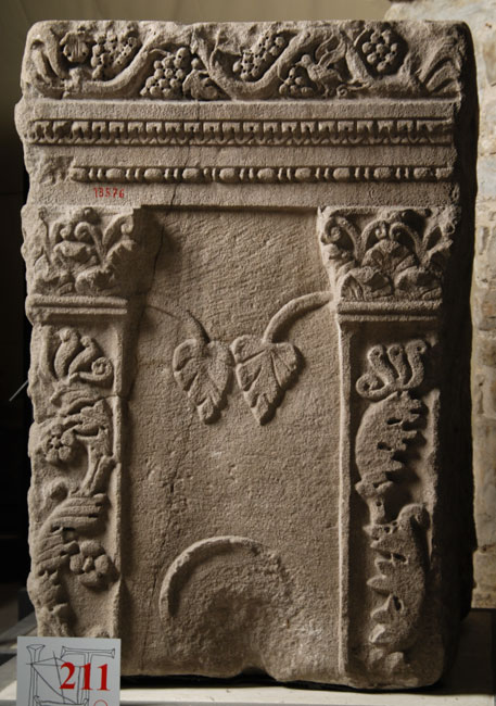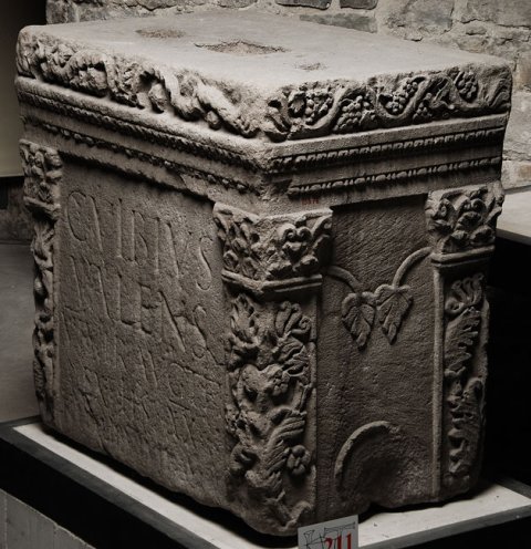- Auf der Deckplattenvorderseite Akanthusranken und Blüten, auf den Nebensdeiten Weinranken, darunter auf drei Seiten Architrav mit Kyma und Astragalstab. An den vier Ecken Pilaster mit vegetabilem Dekor und korinthischen Kapitellen. Auf den Nebenseiten Gefäße (links Kanne, rechts Schale, darüber jeweils zwei Blätter).