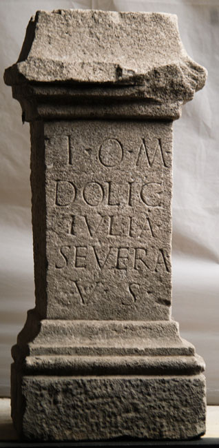 - I(ovi) O(ptimo) M(aximo) / Dolic(heno) / Iulia / Severa / v(otum) s(olvit)