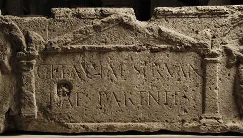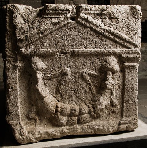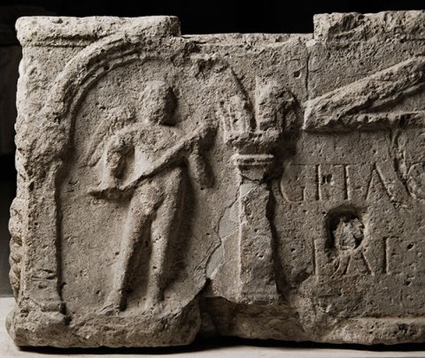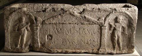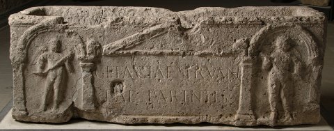 - Vorder- und Nebenseiten architektonisch gegliedert. Vorn Giebel zwischen zwei Bögen auf Pilastern. Unter dem Giebel die Inschrift, unter den Bögen Genius (Erot) mit Fackel. Auf den Nebenseiten Giebel auf Pilastern, dazwischen Girlande mit Tänien.