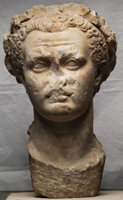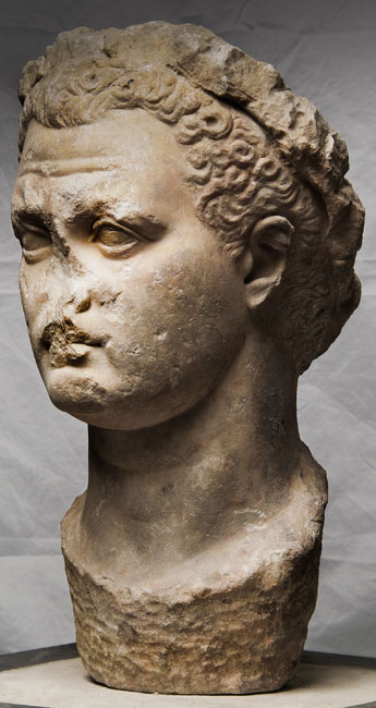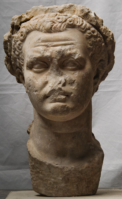 - Historische Person: Kaiser Titus (eventuell überarbeitetes Nero- Porträt ?) mit Eichenlaubkranz.
