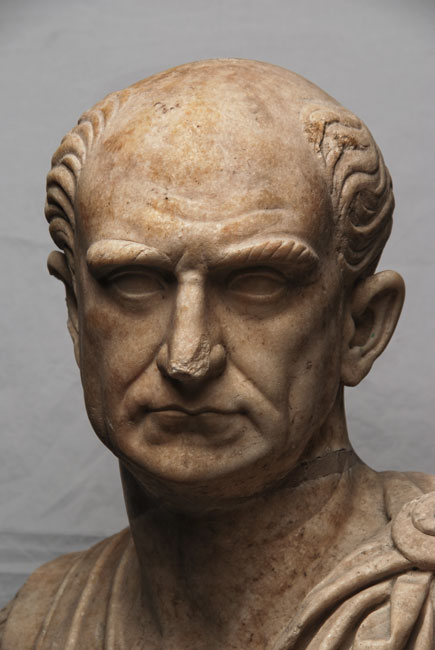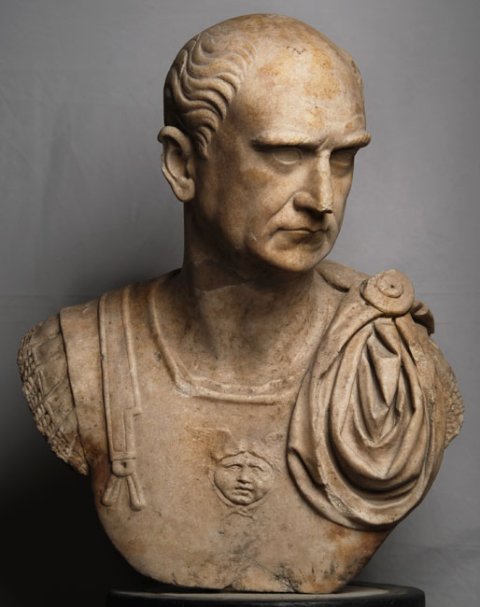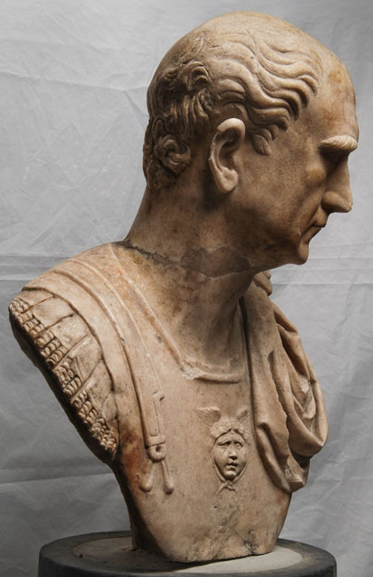 - Historische Person: Quintus Petronius Modestus (?). Büste eines älteren bartlosen Mannes im Muskelpanzer mit Gorgoneion, auf der linken Schulter Mantelbausch mit Scheibenfibel.