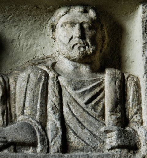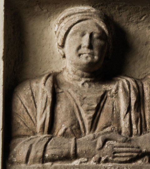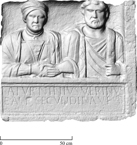 - In Rechtecknische zwei Brustbilder (Ehepaar). Links einheimische Frau: Haube. Fibeln, Umhang, Halsring mit Lunula, Armreif. Rechts Mann: bärtig, Tunica, Sagum mit Fransen, Scheibenfibel, in der Linken Rolle (volumen), Fingerring.