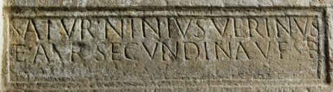 - Saturninius Verinus / et Aur(elia) Secundina v(ivi) f(ecerunt) s(ibi) e[t] / Au[r(elio) ? ---] filio [---]