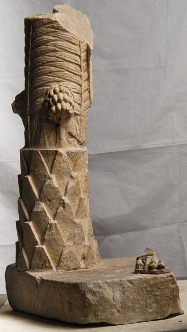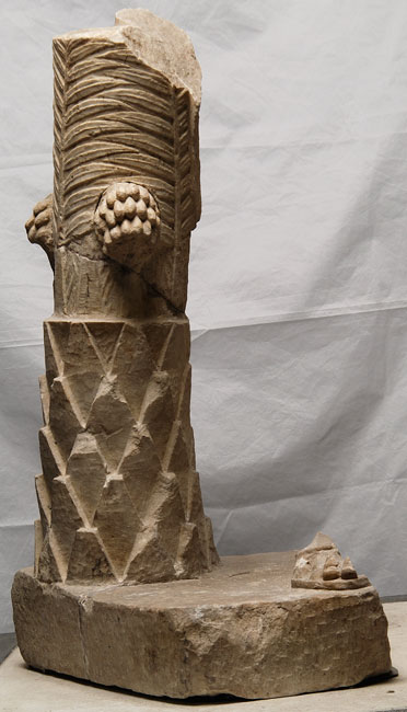 - Statuenstütze in Form eines Palmenstammes, auf der Plinthe Rest eines rechten Fußes mit Sandale (von einer überlebensgroßen Panzerstatue ?).