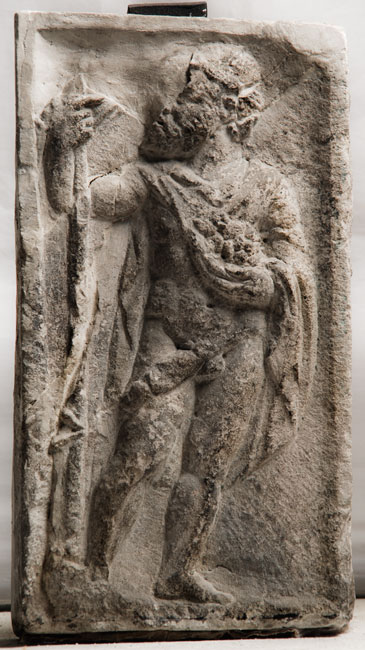 - Mythische Figur : Priapus, die erhobene Rechte auf Stab gestützt, in der Linken Mantelbausch mit Früchten.