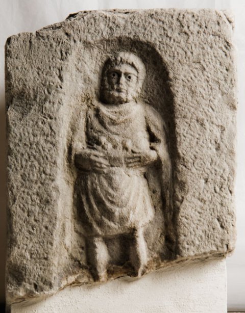 - Mythische Figur (?) : in eingetiefter Bogennische frontal stehender bärtiger Mann in kurzer gegürteter Tunica und Sagum mit Scheibenfibel, in beiden Händen Schale mit Früchten (Silvanus ?).