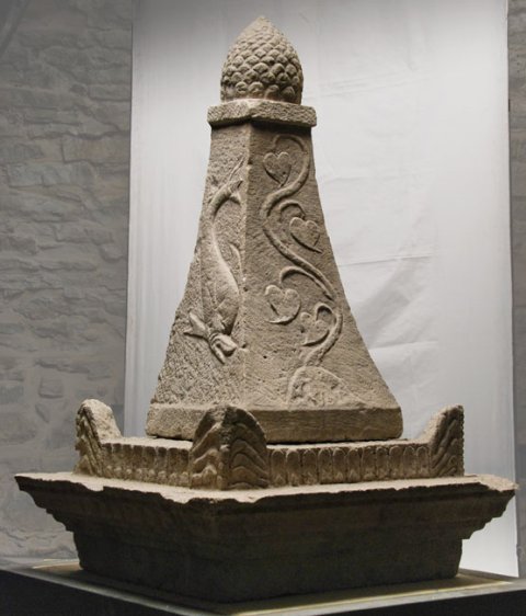 - Pyramidenstumpf mit Pinienzapfen, auf der Vorderseite Efeuranke, auf den Nebenseiten Delphine, Rückseite geschuppt. Deckplatte mit profiliertem Gesims, darauf Pfeifenstabfries und Eckakrotere mit Palmetten.