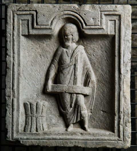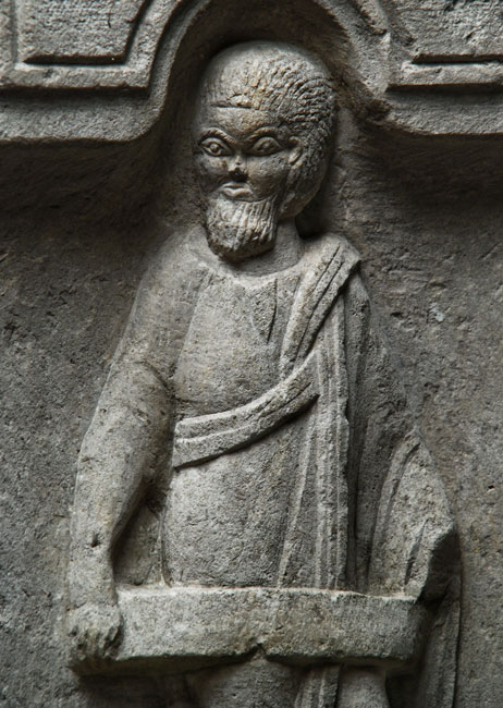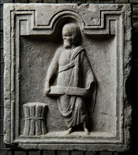 - Profiliert gerahmtes Bildfeld mit stehendem bärtigen Togatus, in beiden Händen geöffnete Rolle (volumen), neben ihm Rollenbündel.