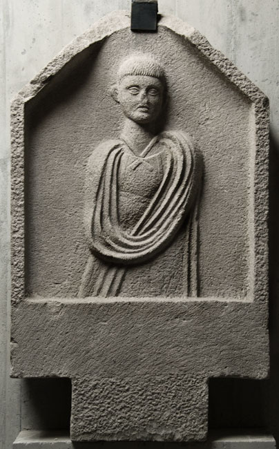 - Stele mit giebelförmigem Abschluss und Einlasszapfen. Im einfach gerahmten Bildfeld Halbfigur eines Knaben im Mantel, darunter hochgegürtetes Gewand, um den Hals vorn gekreuztes Band.