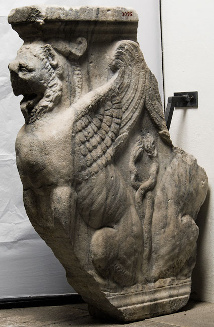 - Mythische Figur: Zwei Rücken an Rücken hockende, geflügelt und gehörnte Löwengreifen, oben und unten profilierte Platte.