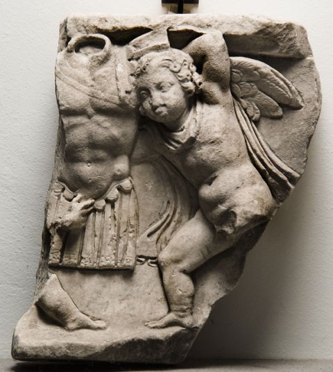 - Eroten mit Waffen (erhalten sind Reste von zwei Figuren, die einen Muskelpanzer tragen)