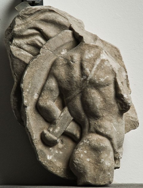 - Mythos (Troja, Kampf bei den Schiffen): nackter Krieger in Rückenansicht nach rechts gehend mit Rundschild und Schwert mit Schwertgurt. Oberhalb des Schildrandes Gewandfalten, links Ansatz eines weiteren Rundschildes.