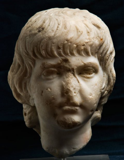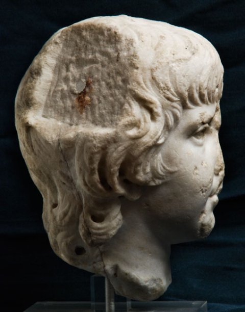 - duch den Hals gebrochen, bestoßen, auf der rechten Seite des Hinterkopf rechteckige Ausnehmung mit Rest eines Metallstiftes