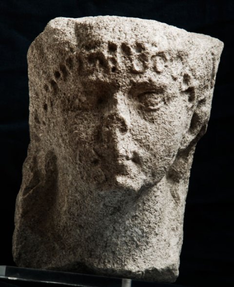 - duch den Halsansatz gebrochen, Oberkopf abgebr., stark verwittert, auf der Rückseite Reste des Reliefgrundes