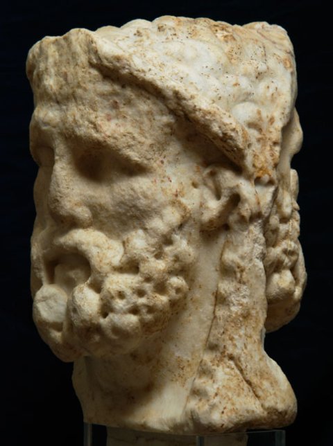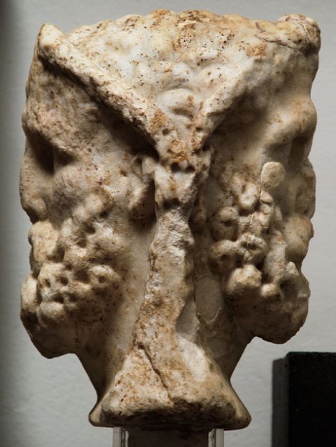 - mythische Figur: Janus mit zwei identischen Köpfen mit gelocktem Bart und Kranz mit Tänien