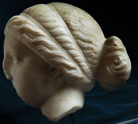 - Mythische Figur: Venus-Kopf mit Nackenknoten, das gewellte Haar von einem schmalen Band zweifach umwunden.