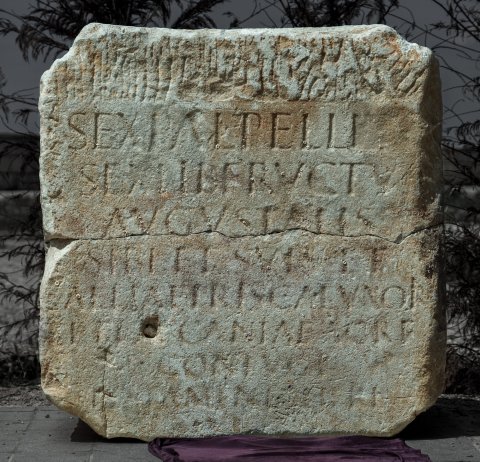 - Sex(tus) Palpelli[us] / Sex(ti) lib(ertus) Fructu[s] / Augustalis / sibi et suis et / Alliae Priscae uxori / et Laecaniae Agre / coniugi / testamento fi[eri] / iussit