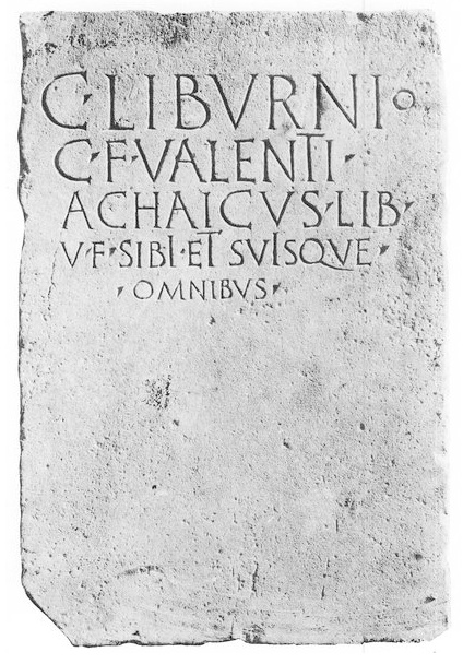 - C(aio) Liburnio / C(ai) f(ilio) Valenti / Achaicus lib(ertus) / v(ivus) f(ecit) sibi et suisque(!) / omnibus
