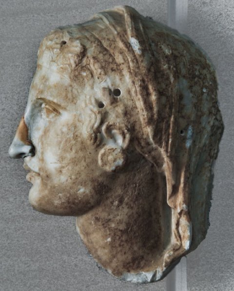 - Kopf einer nach links gewandten Frau mit Ohrschmuck und über den Hinterkopf gezogenem Mantel
