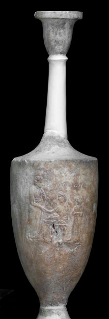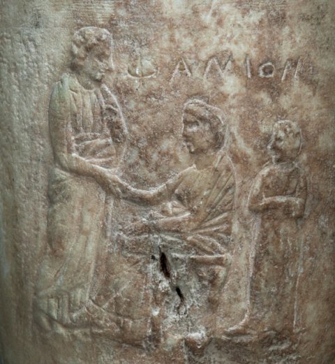- Auf dem Gefäßkörper auf schmaler Standleiste Ehepaar: in der Mitte nach links hin sitzende Frau, die dem vor ihr stehenden Mann die Hand reicht. Hinter dem Stuhl stehendes Mädchen (Dienerin). Über der Frau Inschrift.