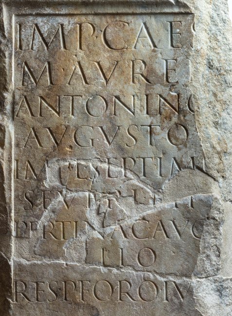 - Imp(eratori) Caes(ari) / M(arco) Aurel(io) / Antonino / Augusto / Imp(eratoris) L(uci) Septimi / Severi Pii / Pertinac(is) Aug(usti) / filio / res p(ublica) Foro Iu[l(iensium)]