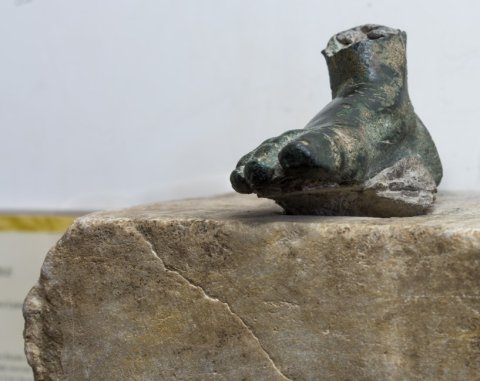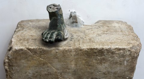 - seitlich verbr., hinten abgebr. (?), auf der Basis rechter Fuß einer Bronzestatuette