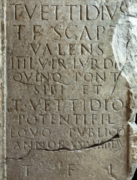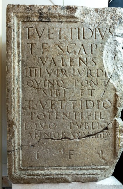 - T(itus) Vettidius / T(iti) f(ilius) Scapt(ia) / Valens / IIIIvir iur(e) di[c(undo)] / quinq(uennalis) pont(ifex) / sibi et / T(ito) Vettidio / Potenti fil(io) / equo publico / annor(um) XX m(ensium) IIII d(ierum) V / t(estamento) f(ieri) i(ussit)