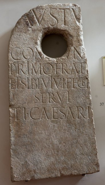 - [F]austu[s] / [et] Com[m]uni[s] / Primo fratr[i] / et sibi vivi fecer(unt) / servi / Ti(beri) Caesaris