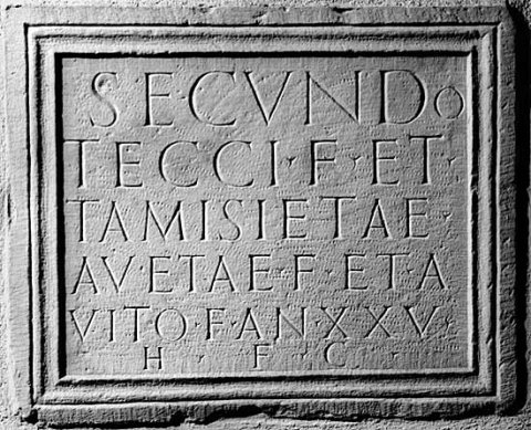 - Secundo / Tecci f(ilio) et / Tamisietae / Avetae(!) f(iliae) et A/vito f(ilio) an(norum) XXV h(eres) f(aciendum) c(uravit)